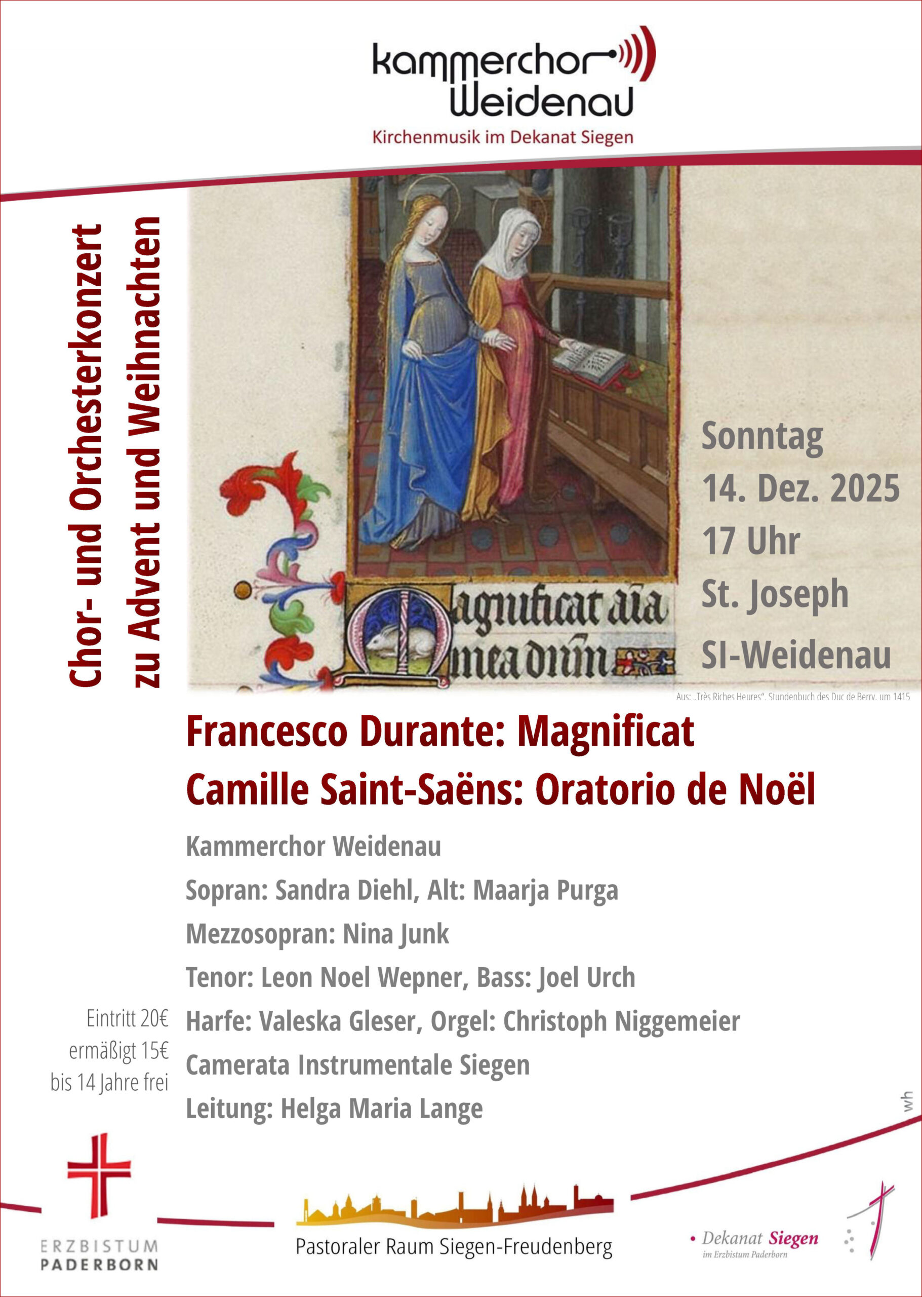 Im Chor-und Orchesterkonzert zu Advent und Vorausklang auf Weihnachten musiziert der Kammerchor Weidenau das Magnificat (Lobgesang Mariens beim Besuch ihrer Base Elisabeth) von dem italienischen Barock-Komponisten Francesco Durante und das wunderschöne zu Herzen gehende Oratorio de Noël von dem französischen romantischen Komponisten Camille Saint-Saëns. Außerdem werden vom Chor adventliche und weihnachtliche „Einlagechoräle“ zum Magnificat gesungen und das Programm durch solistische Beiträge der Harfenistin (Variationen über ein walisisches Weihnachtslied und der Sopranistin (Ave Maria) erweitert. Mitwirkende sind neben dem Kammerchor Weidenau die aus Siegen stammende Sopranistin Sandra Diehl, die Altistin Maarja Purga, der Tenor Leon Wepner, der Bassist Joel Urch, die Harfenistin Valeska Gleser und die Camerata Instrumentale Siegen unter Leitung von DKM Helga Maria Lange.