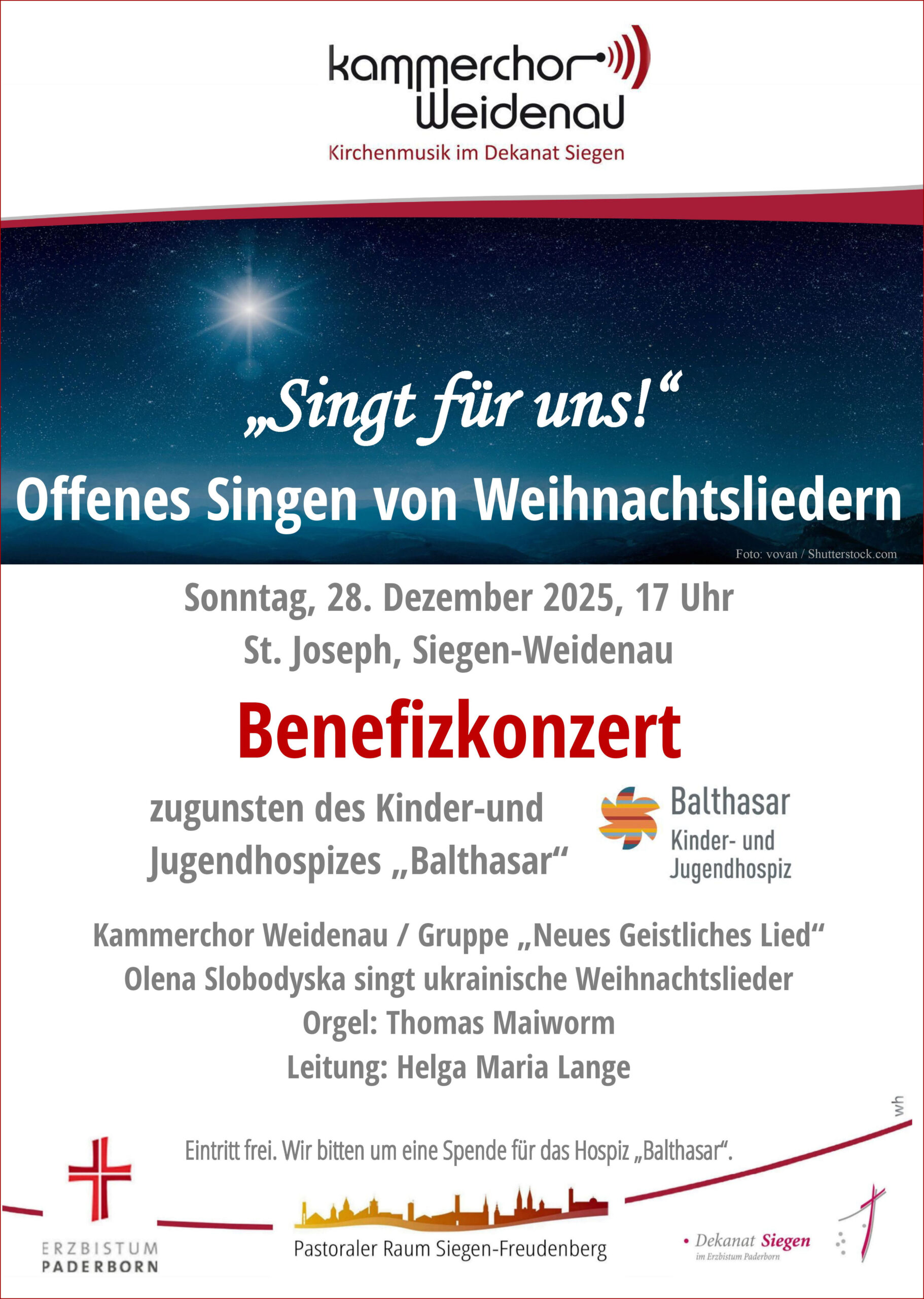 Auch in diesem Jahr findet ein “Offenes Singen zur Weihnachtszeit” mit deutschen und englischen Weihnachtsliedern statt. Mitwirkende sind wieder der Kammerchor Weidenau und die Gruppe Neues Geistliches Lied unter Leitung von Helga Maria Lange und Thomas Maiworm an der Orgel. Als besonderer Gast ist die ukrainische Sängerin Olena Slobodyska eingeladen worde, die durch ihre erfolgreiche Teilnahme an “Voice of Germany” nun bekannt geworden ist und ukrainische Weihnachtslieder singen wird.