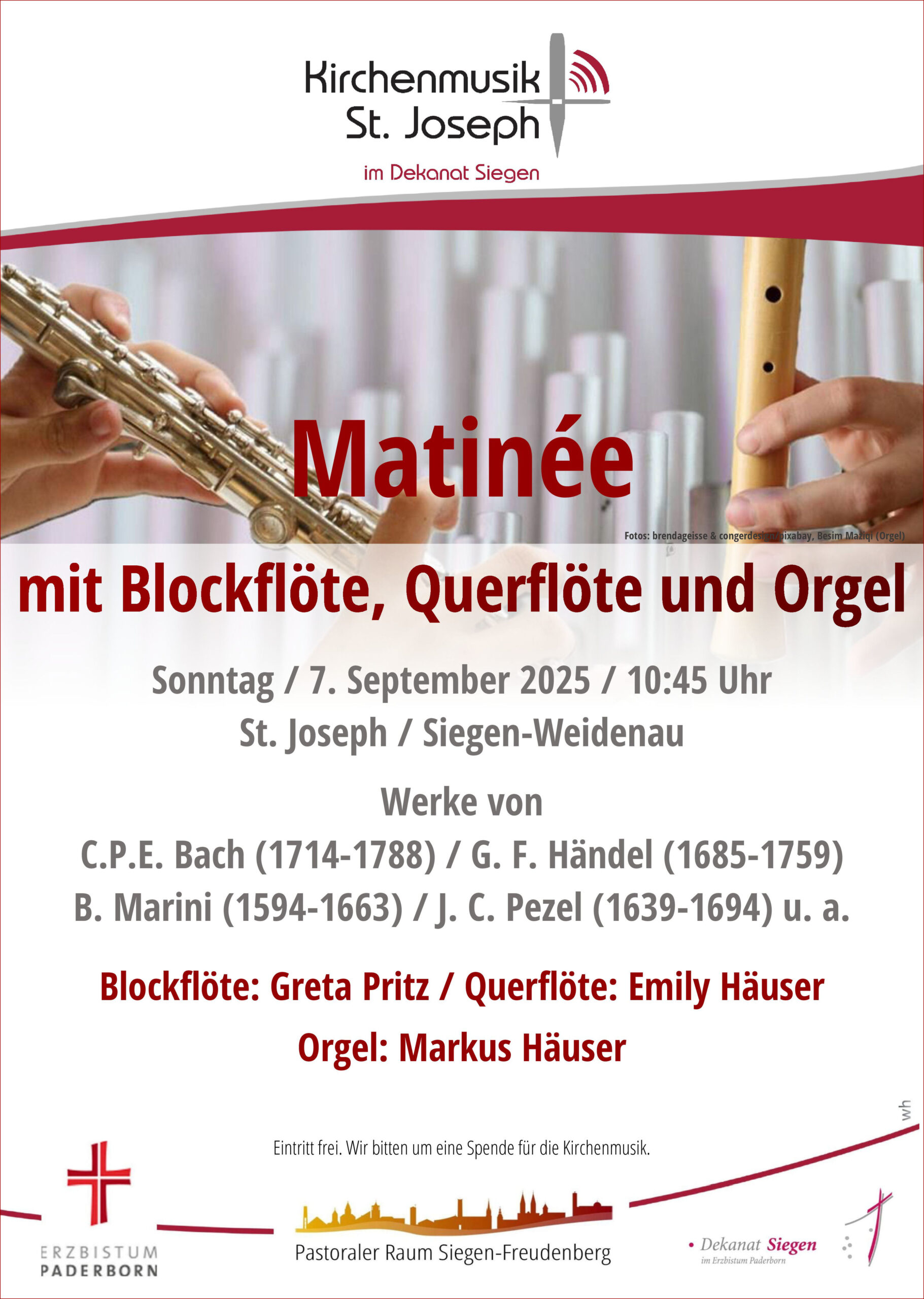 mit seiner Tochter Emily (Querflöte) und deren Freundin Greta Pritz (Blockflöte) Werke von Carl Philipp Emanuel Bach, Georg Friedrich Händel, Biagio Marini und Johann Christoph Pezel. Der Eintritt ist frei.