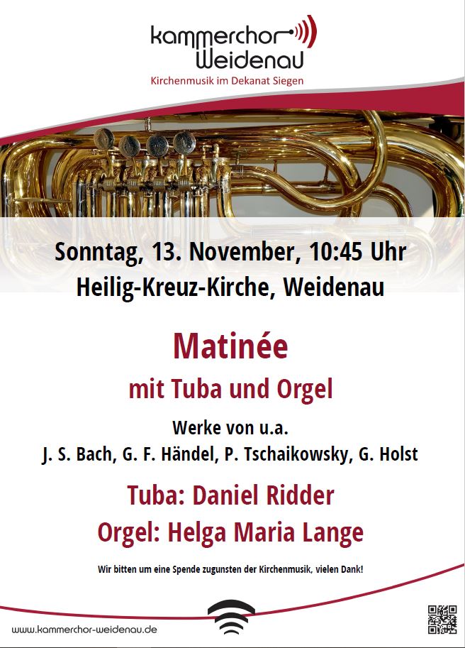 Am Sonntag, den 13. November 2022 findet die monatliche Matinée aufgrund der Renovierungsarbeiten in St. Joseph nun in der Heilig-Kreuz-Kirche (Kolumbariumskirche), Weidenau, statt. Im Anschluss an die Messe spielen ab 10:45 Uhr Daniel Ridder (Tuba) und DKM Helga Maria Lange Werke von J.S. Bach, G. F. Händel, P. Tschaikowsky und G. Holst. Der Eintritt ist frei.